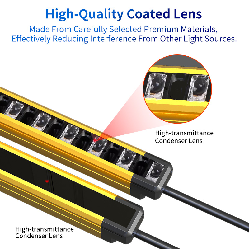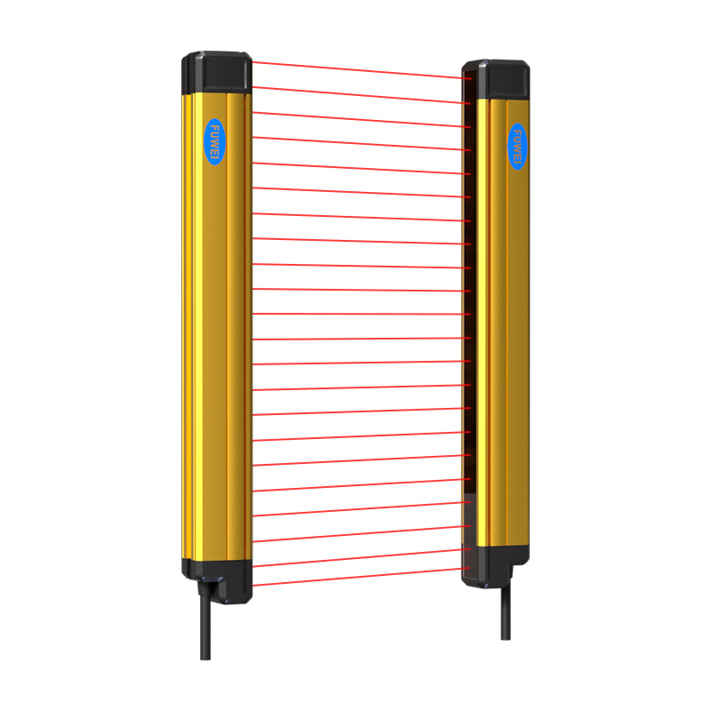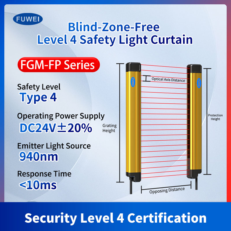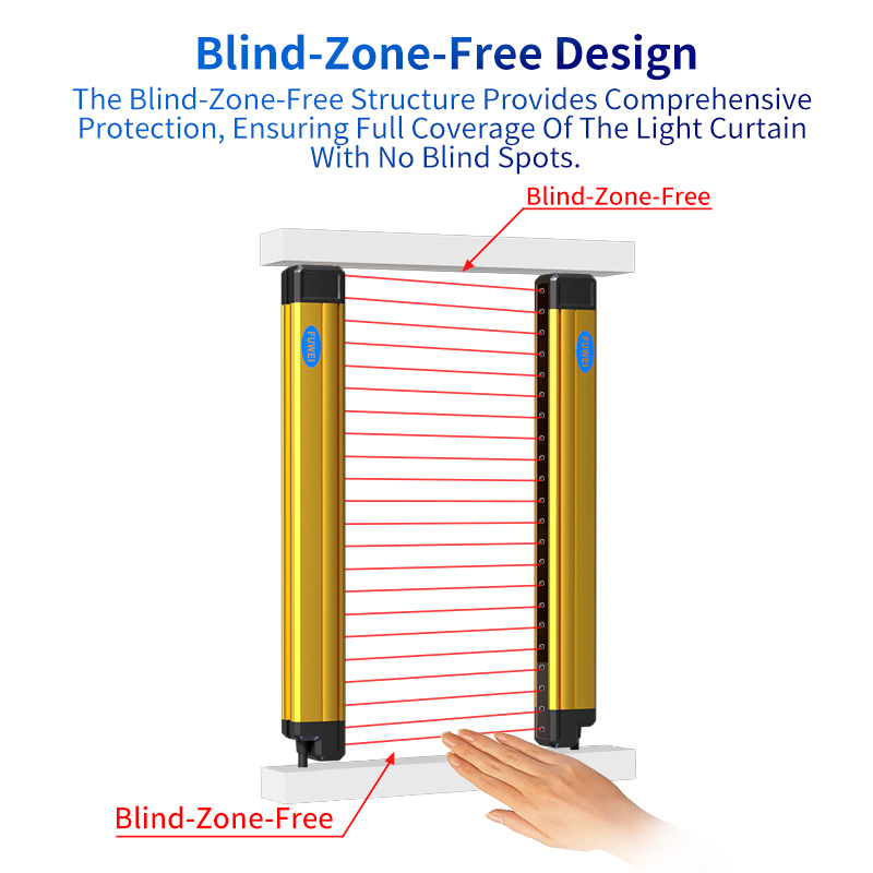 Blind-Zone-FreeLevel 4-veiligheidslichtgordijn FGM-FP1220-L1NC-5 Blind-vrije structuur biedt uitgebreide bescherming Biedt rondom roosterdekking, waardoor er geen blinde zones ontstaan;