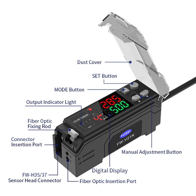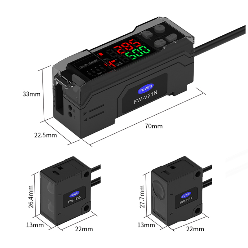 De coaxiale sonde RGB-lichtbron kleursensor FW-V21N is een veelzijdige en kosteneffectieve oplossing voor kleurdetectietaken, met een 8-kanaals ontwerp dat gelijktijdige detectie van 4 kleuren mogelijk maakt, waardoor zowel kosten als installatieruimte worden bespaard. In combinatie met een speciale kleurensonde identificeert het nauwkeurig meer dan 3000 kleuren, terwijl de versterkers met hoge resolutie (ondersteunende drievoudige 16-bit berekeningen) ervoor zorgen dat zelfs micro-chromatische afwijkingen worden herkend. Met meerdere detectiemodi die passen bij verschillende toepassingsscenario's, levert deze sensor precisie en aanpassingsvermogen voor uw kleurgevoelige behoeften.
