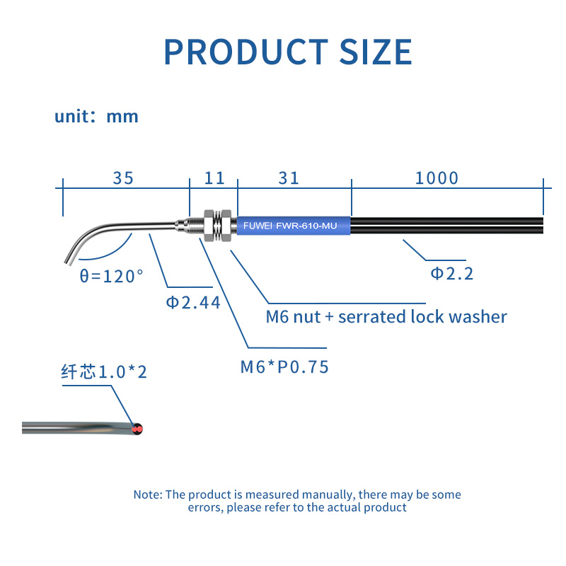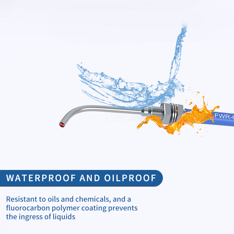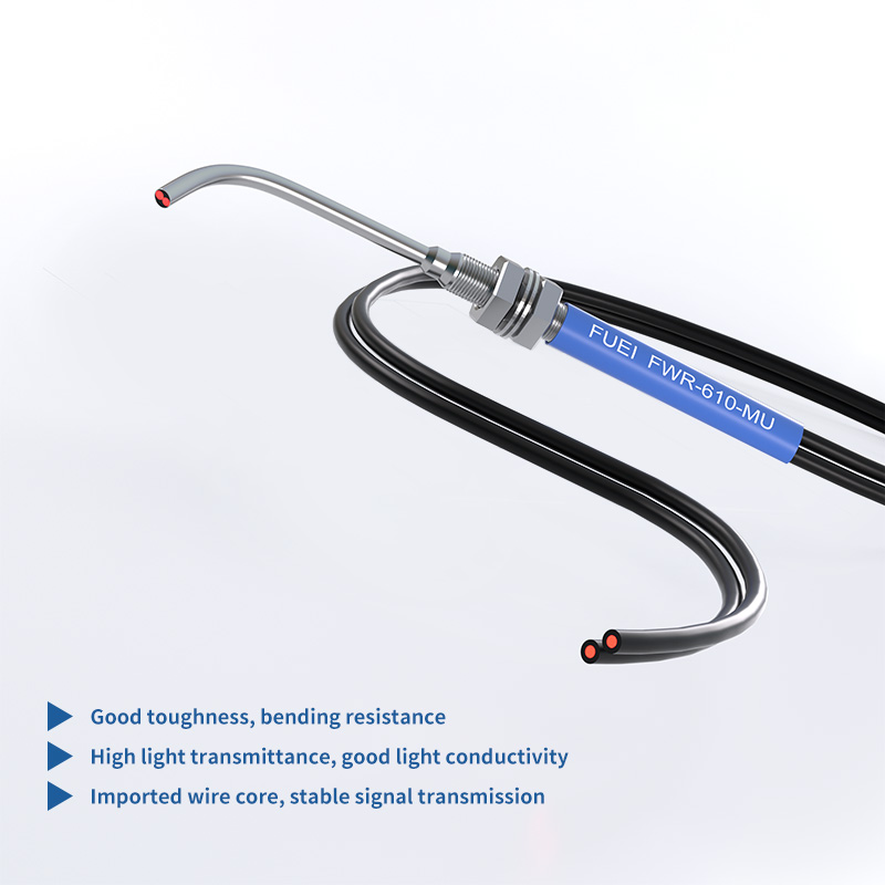 De FWR-610-15D elleboog 90 graden glasvezelsensor is voorzien van een elleboogvormig glasvezelontwerp, waardoor deze zeer geschikt is voor installatie in speciale omgevingen waar hoekige of beperkte ruimtes aanwezig zijn. Het beschikt over een goede taaiheid en sterke buigweerstand, waardoor betrouwbare prestaties worden gegarandeerd, zelfs wanneer het wordt blootgesteld aan buigkrachten, wat cruciaal is voor het behoud van de functionaliteit in uitdagende opstellingen. Uitgerust met een hoge lichttransmissie en uitstekende lichtgeleiding, garandeert de sensor een efficiënte en consistente lichttransmissie, wat nauwkeurige detectieoperaties ondersteunt. Bovendien verbetert de geïmporteerde draadkern de stabiliteit van de signaaloverdracht, waardoor de betrouwbaarheid in verschillende industriële toepassingen die consistente en nauwkeurige prestaties vereisen, verder wordt versterkt.