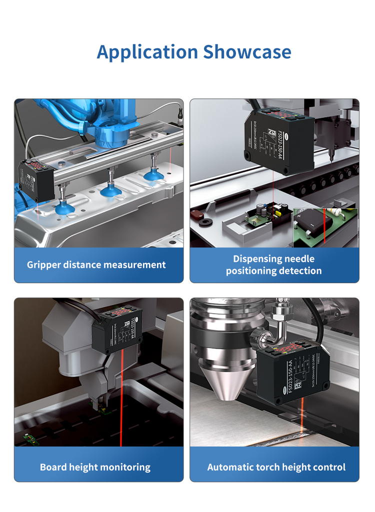 Traditionele sensoren worden vaak gedwongen om meerdere modellen van apparatuur aan te passen vanwege een smal bereik (zoals een vaste detectiebereik van 30 mm), wat resulteert in een toename van de implementatiekosten van de productielijn. FSD23-serie laserverplaatsingssensoren realiseren echter een continu instelbaar detectiebereik van 10 mm tot 250 mm door zelf ontwikkelde optische module dynamische focustechnologie, die geschikt is voor alle scenario's variërend van micronchip-soldeeringsverbindingen tot automotive plaathonden gaten.
