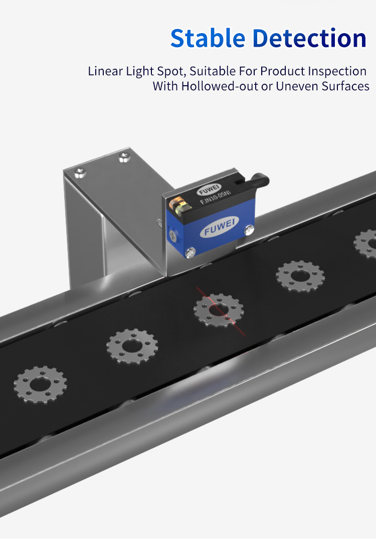 Het innovatieve ontwerp van de zichtbare laserbarspot biedt de optimale oplossing voor speciale oppervlaktedetectie. Traditionele single-point lasersensoren kunnen vaak objecten niet detecteren wanneer ze worden geconfronteerd met werkstukken zoals versnellingstanden, geperforeerde platen of golfplaten, omdat de plek slechts een enkel punt bedekt. Wanneer de plek precies op een hol gebied valt of het laagste punt van een depressie, kan de sensor deze ten onrechte beoordelen als 'geen object'. De FJN10-05NI maakt gebruik van een speciale asferische optische lensgroep om de laser samen te brengen in een lineaire plek van 10 mm lang en 0,8 mm breed, waardoor het detectiegebied 12 keer wordt uitgebreid in vergelijking met single-point sensoren. Bij het detecteren van warmte -dissipatiegaten in het metalen frame van een smartphone, kan de lineaire plek tegelijkertijd 3-4 gaten en de omliggende vaste gebieden bedekken. Door de verdeling van gereflecteerd licht te analyseren, bepaalt de sensor of het werkstuk aanwezig is, waardoor een detectienauwkeurigheid van 99,97%wordt bereikt.
