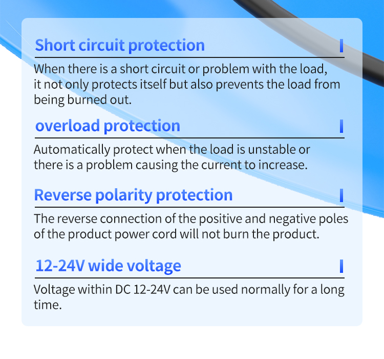 Omgekeerde polariteitsbescherming: bestand is tegen onjuiste polariteitsverbinding zonder schade, het voorkomen van storingen en verliezen veroorzaakt door bedradingsfouten.