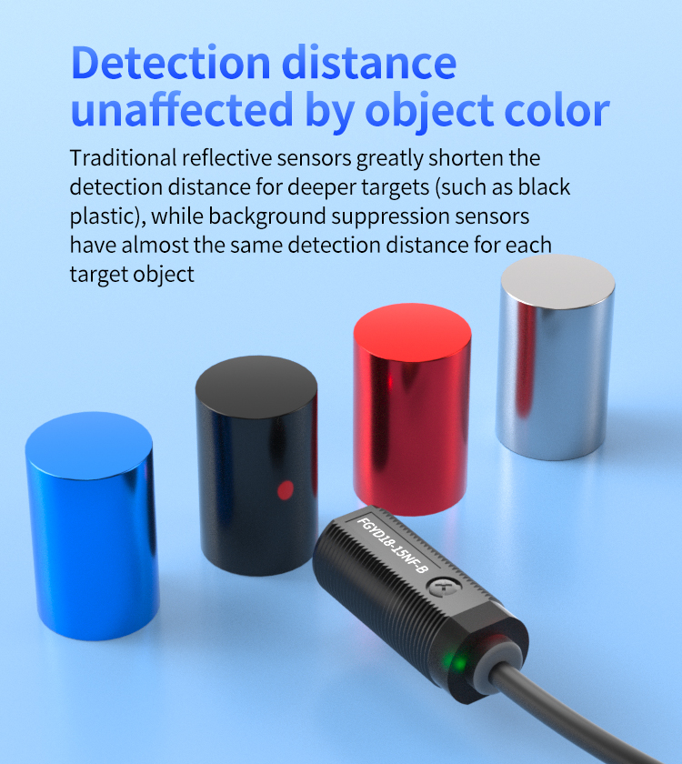 Conventionele reflecterende sensoren zijn zeer vatbaar voor variaties in detectieafstand die worden beïnvloed door doelkleur en materiaal, met name het opsporen van steile afstand bij het detecteren van donkere objecten. De FGYD18 -serie maakt gebruik van achtergrondonderdrukkingstechnologie. Met behulp van gespecialiseerde interne optische componenten en triangulatieprincipes ontvangt het niet alleen gereflecteerde lichtintensiteit. In plaats daarvan berekent het de positie van de lichte plek om de aanwezigheid van een object te bepalen. Dit stelt het in staat om achtergrondinterferentie effectief te negeren en de detectiefocus nauwkeurig op een vooraf ingestelde afstand te vergrendelen. Bijgevolg bereikt het bijna consistente detectieafstanden voor zwarte, witte of andere gekleurde objecten, wat de betrouwbaarheid en consistentie van detecties aanzienlijk verbetert.