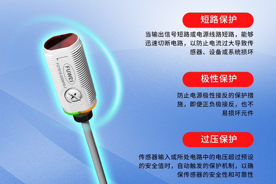 De uitzonderlijke prestaties van de sensor worden voor het eerst gedemonstreerd door het uitgebreide drievoudige beveiligingssysteem. In het geval van kortsluiting in het uitgangssignaal of kortsluiting in de stroomlijn kan het apparaat het circuit binnen milliseconden loskoppelen, waardoor schade aan het systeem door overbelasting effectief wordt voorkomen. Een uniek polariteitsbeschermingsontwerp zorgt ervoor dat zelfs als operators per ongeluk de polariteit van de voeding omkeren, de kerncomponenten van de sensor intact blijven. Het overspanningsbeveiligingsmechanisme wordt automatisch geactiveerd wanneer de ingangsspanning de vooraf ingestelde veiligheidslimieten overschrijdt, en biedt uitgebreide waarborgen voor een stabiele werking in complexe industriële omgevingen.