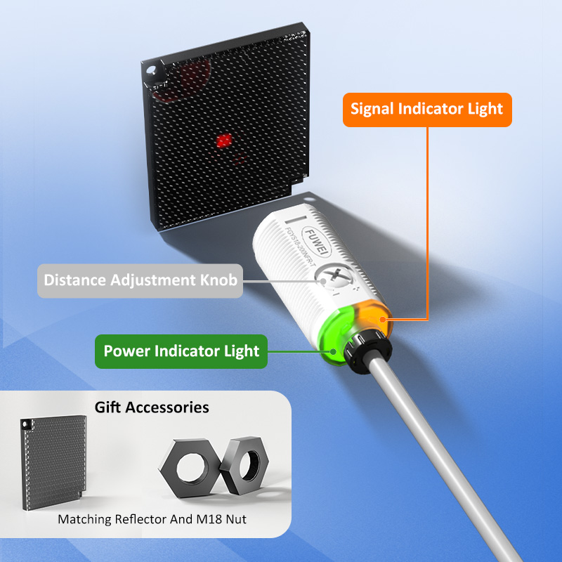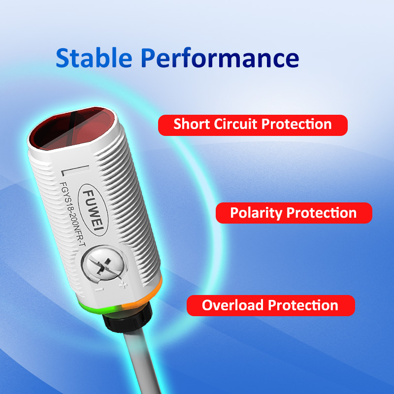 De FGYS18-200NFR-T professionele detectiesensor voor transparante flessen maakt gebruik van een geavanceerd lensreflectieprincipe en gecoate optische filtertechnologie om uitdagingen op het gebied van de detectie van transparante containers effectief op te lossen. Het beschikt over een instelbaar detectiebereik van 2 meter met zichtbare rode lichtvlek voor nauwkeurige positionering. Uitgerust met drievoudige beveiligingsmechanismen (kortsluiting, omgekeerde polariteit en overspanning) en kwartslens die bestand is tegen thermische vervorming, zorgt het voor een stabiele optische sensor Transparante objectdetectie Spiegelreflectie M18 2m detectieafstand Cilindrische sensorwerking in ruwe industriële omgevingen met uitzonderlijke anti-interferentiemogelijkheden, waardoor het een betrouwbare keuze is voor geautomatiseerde productielijnen.
