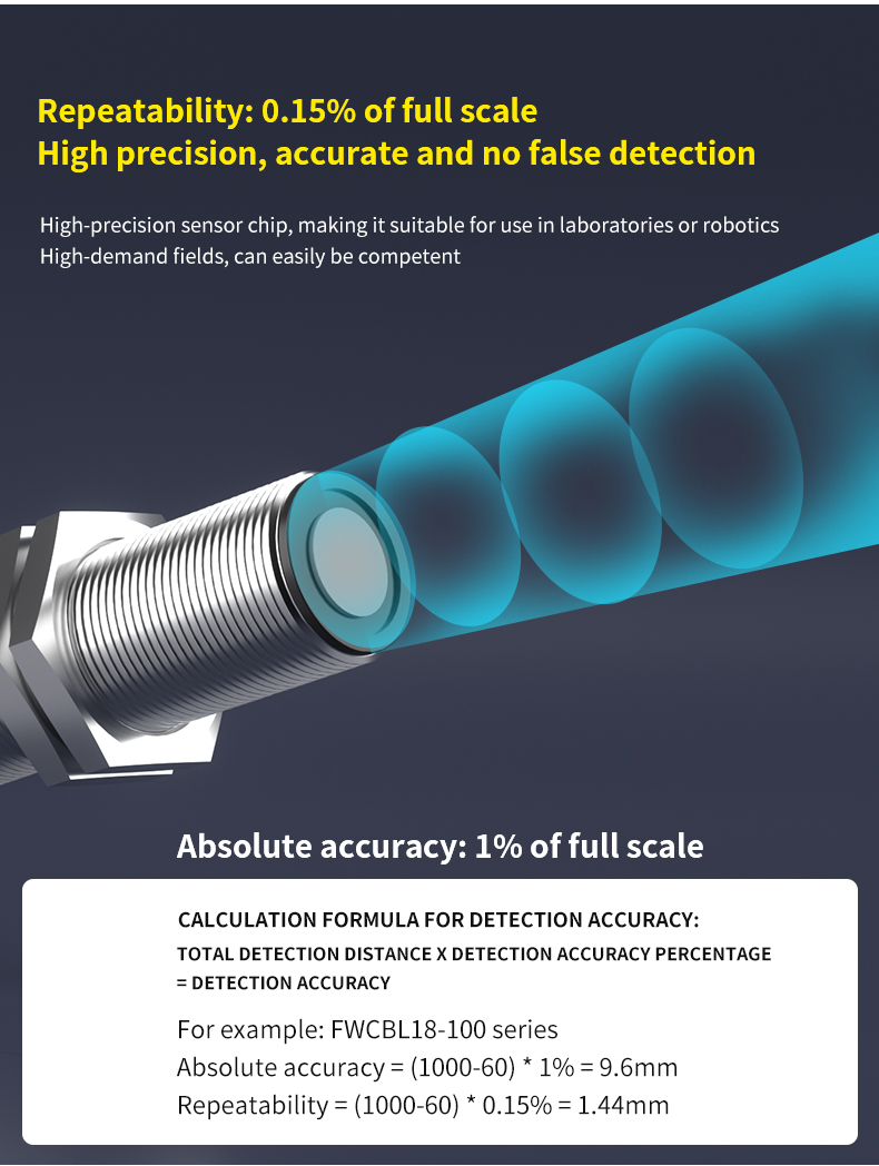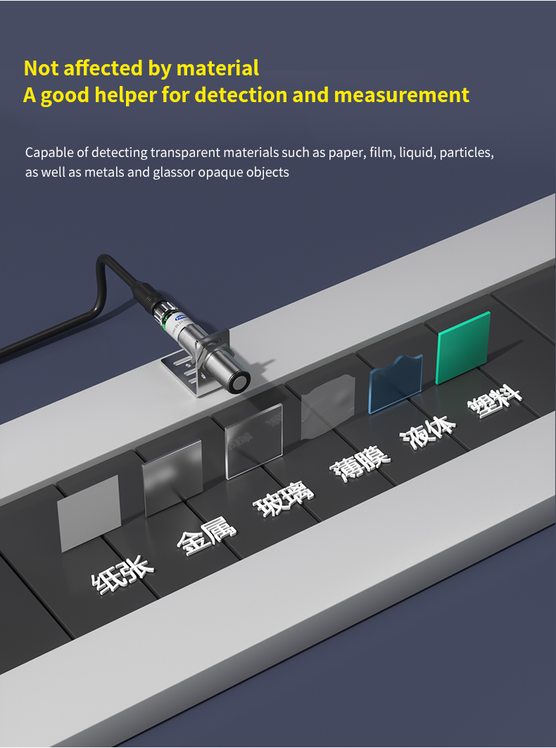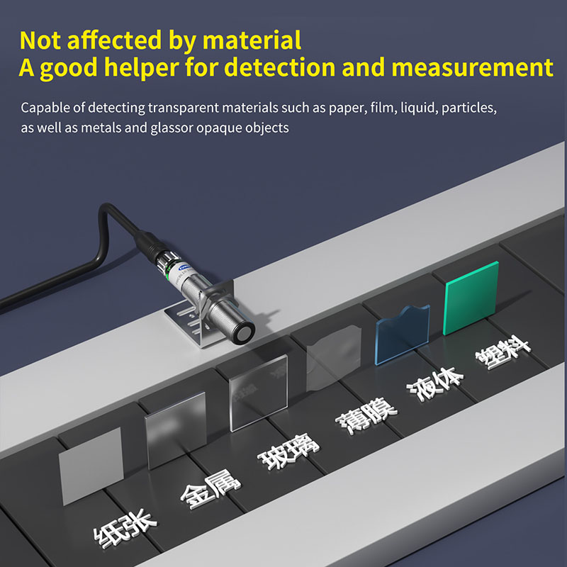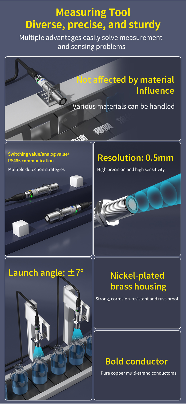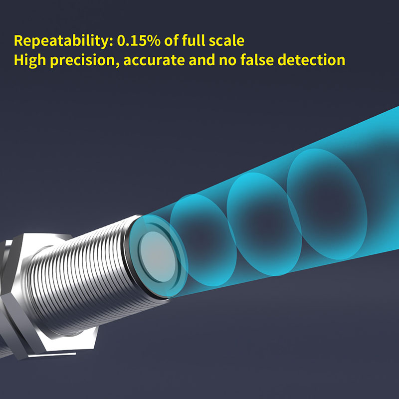 Met een hoge nauwkeurigheid van 0,5 mm resolutie en een smalle stralingshoek van ±7°, zorgt het voor extreme meetnauwkeurigheid en uitstekende weerstand tegen interferentie. Ongeacht het doeloppervlak (lichtabsorberend, reflecterend of transparant) levert het stabiele prestaties, volledig onaangetast door het materiaal of de kleur van het gedetecteerde object.